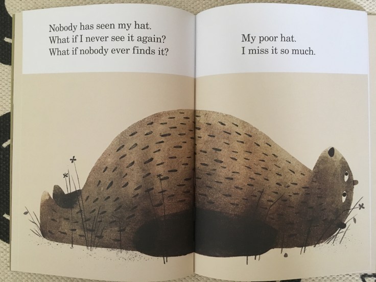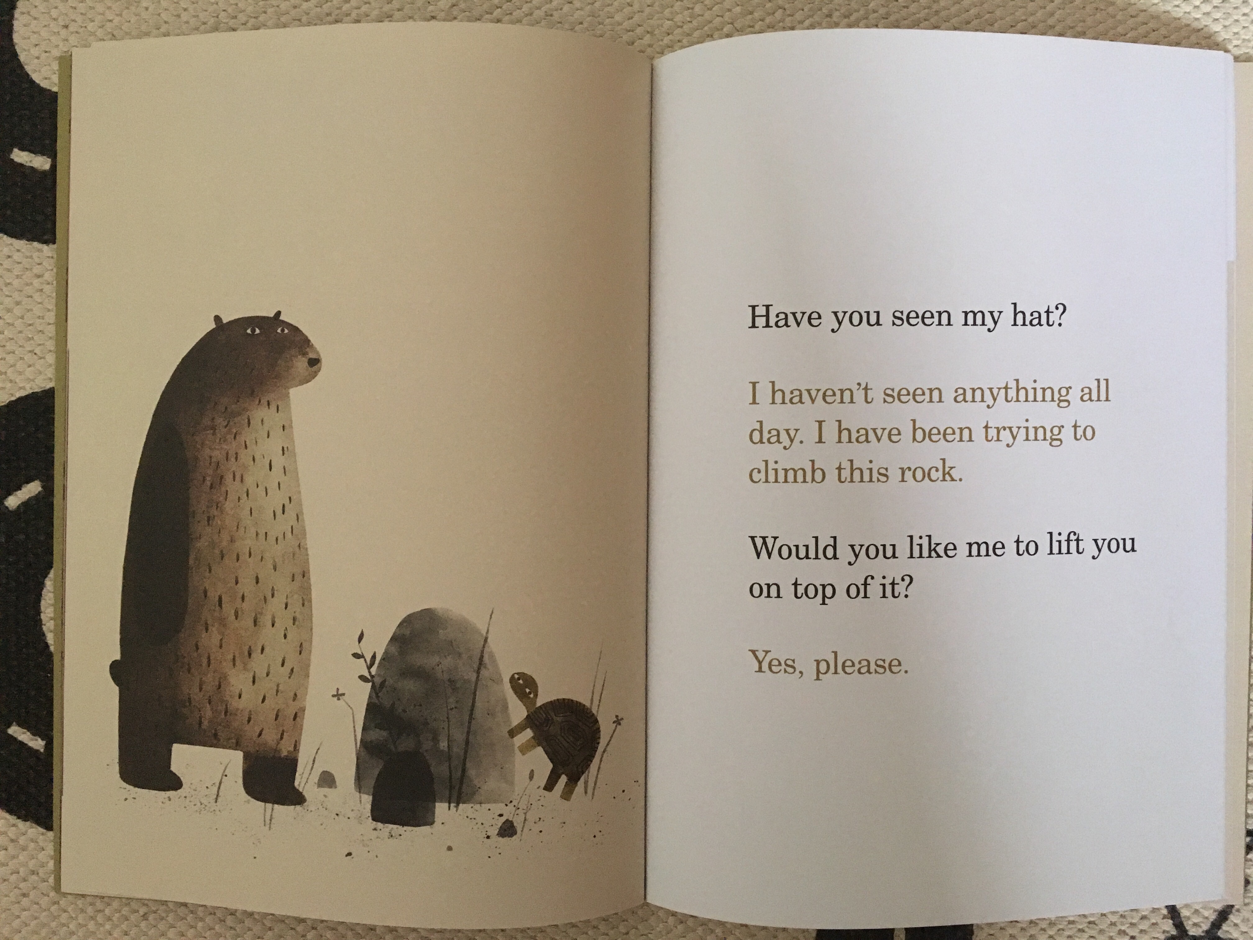 The story is straightforward. A bear has lost his hat and sets out to find out. As you turn each page, he meets a new creature who he politely questions on the whereabouts of his headwear.