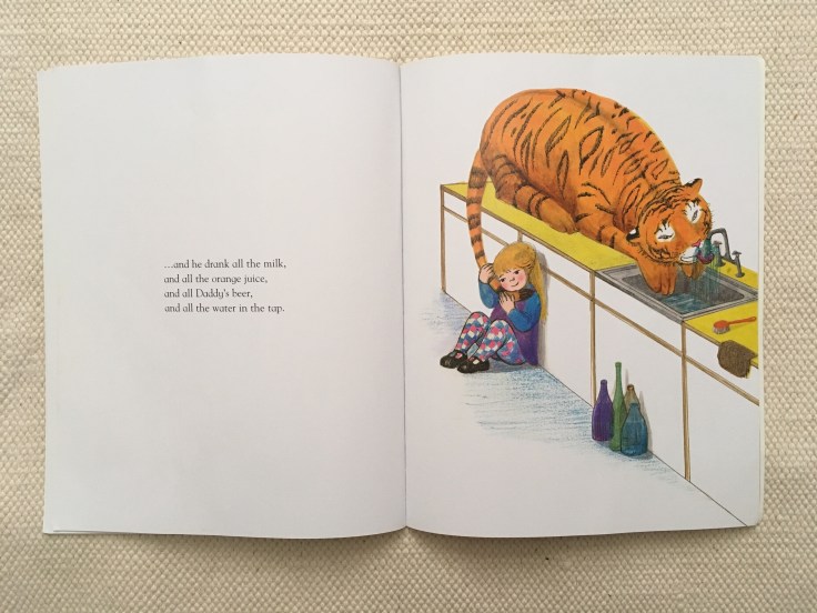 The unflappable nature of Mummy in the face of their visitor, the joy on Sophie’s face as she cuddles the tiger’s tail against her chin and the tiger’s big beaming grin are just a joy.