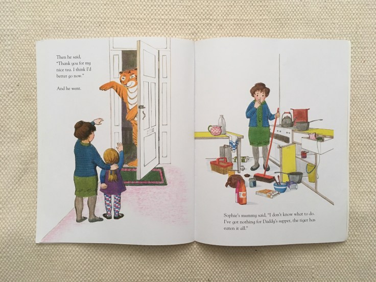 I also love the contrast between the fantastical events at afternoon tea and the simple trip out to the cafe for a sausage and chips supper after the tiger has eaten Daddy’s dinner. To a child, going out past bedtime in your nightie for a chippie tea is as much an adventure as a tiger eating cake in your kitchen.