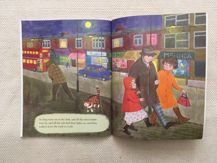 The Sixties fashions – from Mummy’s top bun to Daddy’s checked trousers and hat – are charming and the yellow formica dining table reminds me of the one my nan used to have. They don’t age the book – they enhance it.