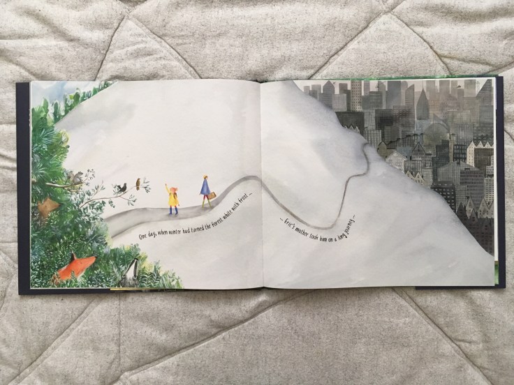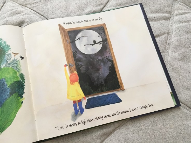 It tells the story of a boy called Eric who lives a happy, colourful life in the forest with his animal friends until his mother takes him to live in the city. Everything is strange and grey – even the moon looks different – but as he explores, he finds new beauty, new friends and realises he will never be alone when he has the moon.