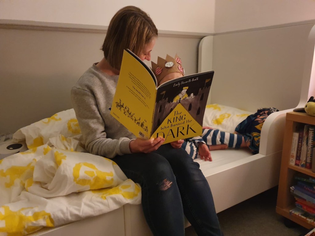 I’ve volunteered to go first and since we made a crown for our online Toddler Sense session yesterday, the boy wants us to read The King Who Banned The Dark.